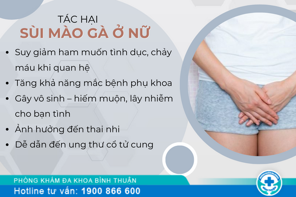 Bệnh sùi mào gà ở nữ giới cũng có mức độ nguy hiểm không kém gì nam giới, ngoài sự đau đớn, khó chịu, gây tâm lý hoang mang, lo sợ,… thì sùi mào gà ở nữ giới có những ảnh hưởng nghiêm trọng khác như: