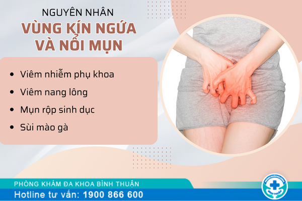 Nổi mụn ở vùng kín có thể gây ngứa hoặc không ngứa. Mỗi loại mụn sẽ có nguyên nhân và dấu hiệu khác nhau, bao gồm: