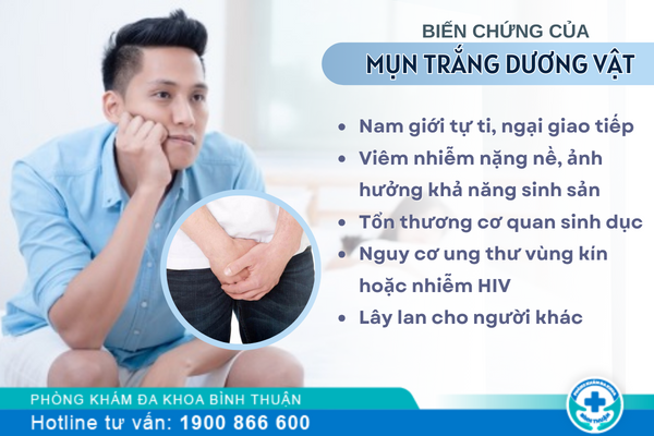 Các nốt mụn trắng ở dương vật này thường kéo dài, sau đó mọc thành đám lớn gây đau, ngứa, khó chịu. Nhiều trường hợp nặng khi các mụn bị viêm loét, nhiễm trùng, chảy mủ gây nhiều đau đớn cho người bệnh.