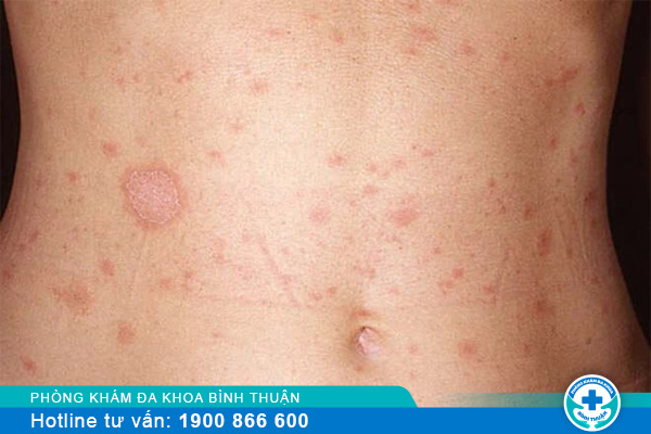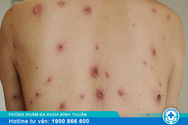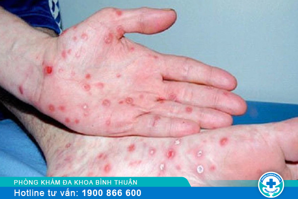 Hình ảnh giang mai giai đoạn 2: Một thời gian sau, sẽ xuất hiện tiếp các nốt ban màu hồng ở khắp cơ thể kèm theo một số triệu chứng như: đau đầu, sốt cao về đêm, đau nhức xương khớp, mệt mỏi, sưng hạch bạch huyết, đau họng,…