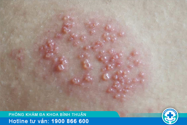 ► Thời gian bùng phát: Tại vị trí nhiễm bệnh bị sưng, đỏ, mềm và đau nhức; sau đó sẽ xuất hiện mụn nước li ti và dần dần phồng rộp lên. Khi mụn vỡ ra sẽ hình thành vết loét nông chảy dịch hoặc chảy máu gây đau rát nhiều. Đi kèm với đó là cảm giác ngứa ran, nóng rát xung quanh vết loét, có thể sốt nhẹ, đau nhức cơ, sưng hạch. Các nốt mụn nước có thể diễn biến phức tạp.