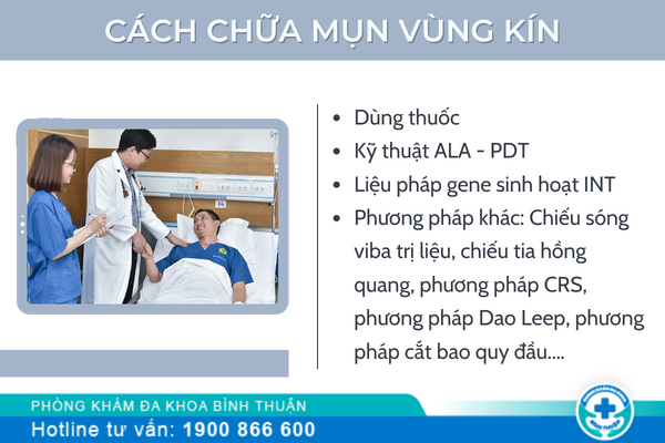 Do đó, các trường hợp nổi mụn vùng kín cần được thăm khám kỹ càng bởi bác sĩ chuyên khoa để tìm ra nguyên nhân cụ thể. Tùy mức độ bệnh lý, thể trạng và nguyên nhân gây mụn sinh dục, các bác sĩ sẽ đưa ra phương án điều trị thích hợp. Cụ thể: