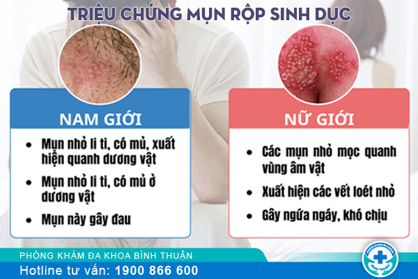+ Mụn rộp ở nữ: Mụn có thể xuất hiện riêng rẽ hoặc từng chùm có kích thước nhỏ và thường xuất hiện ở âm đạo hậu môn và các môi sinh dục. Ngoài ra người bệnh sẽ có triệu chứng sốt cao, nhức đầu, chán ăn, nổi hạch bạch huyết ở bẹn…