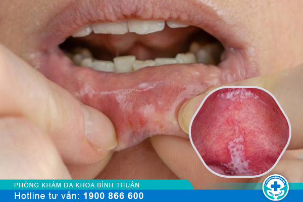 Trên lưỡi, khoang miệng, mọc những nốt mụn mủ, mụn đỏ, gây viêm loét niêm mạc miệng kèm theo mùi hôi khó chịu.